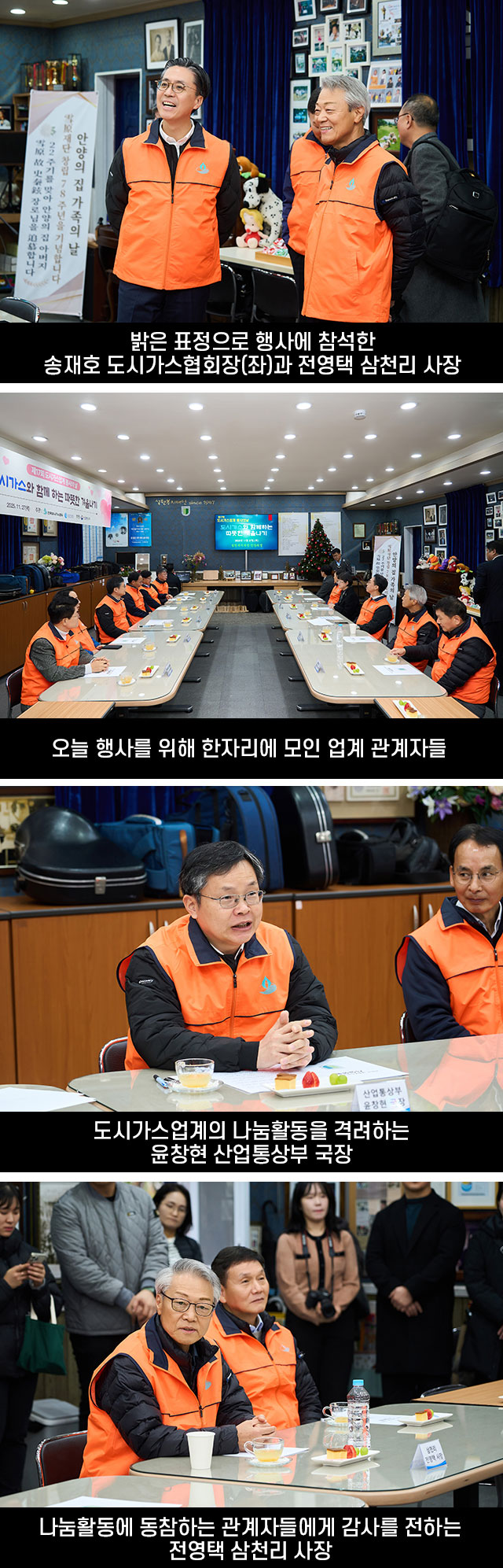삼천리가 한국도시가스협회와 함께 경기도 안양시에 위치한 아동양육시설 ‘안양의집’에서 도시가스업계 봉사의 날 대표행사를 개최했다. 이날 행사에는 윤창현 산업통상부 자원산업정책 국장, 송재호 도시가스협회장, 전영택 삼천리 사장, 안양의집 이정혜 이사장 등을 비롯해 수도권 도시가스 사장단과 삼천리 임직원 등 40여 명이 참석했다. 이 행사는 도시가스를 통해 지역사회에 따뜻함을 전하는 전국 도시가스기업들이 지역사회와 상생하기 위해 또 지역민들로부터 받은 사랑을 다시 나누기 위해 만든 행사로 매년 진행되고 있다. 도시가스가 더욱 필요해지는 겨울이 다가오면 전국의 모든 도시가스사들이 각 지역에서 일제히 나눔활동을 펼치고 있으며 그중 수도권 도시가스 7개 기업은 이렇게 함께 모여 행사를 치르고 사회공헌활동을 전개한다.
