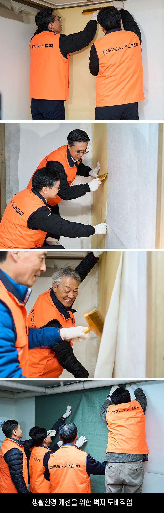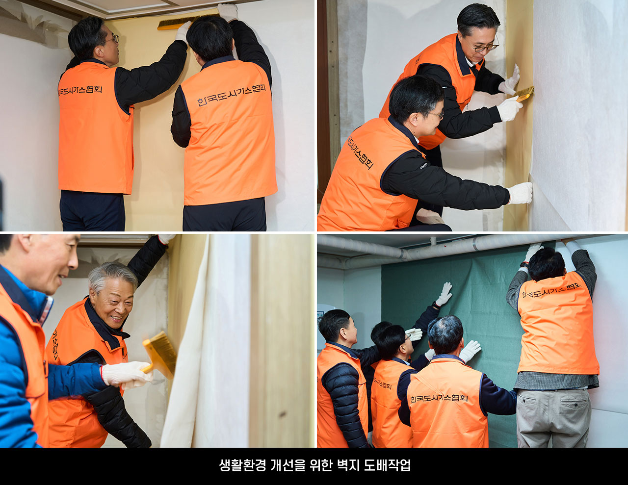 이날 행사에 참석한 관계자들은 우선 복장을 갖추고 노후된 생활관으로 자리를 옮겼다. 미리 기본 작업을 해둔 벽과 거실에 깔끔한 벽지를 새로 덮는 마무리작업을 하기로 한 것. 윤창현 산업통상부 국장이 “봉사하러 온 만큼 열심히 하다 가겠다”며 팔을 걷어붙이자 도배 작업 경험이 많다는 송재호 도시가스협회장이 “벽지는 위쪽부터 붙여야 한다”며 시범을 보인다. 옆에서 함께 작업하던 전영택 삼천리 사장은 “벽지가 울면 안 된다”며 방금 붙인 벽지를 다시 한번 꼼꼼하게 마무리하며 짧은 순간에도 조화로운 팀워크을 보여주는 모습이었다.