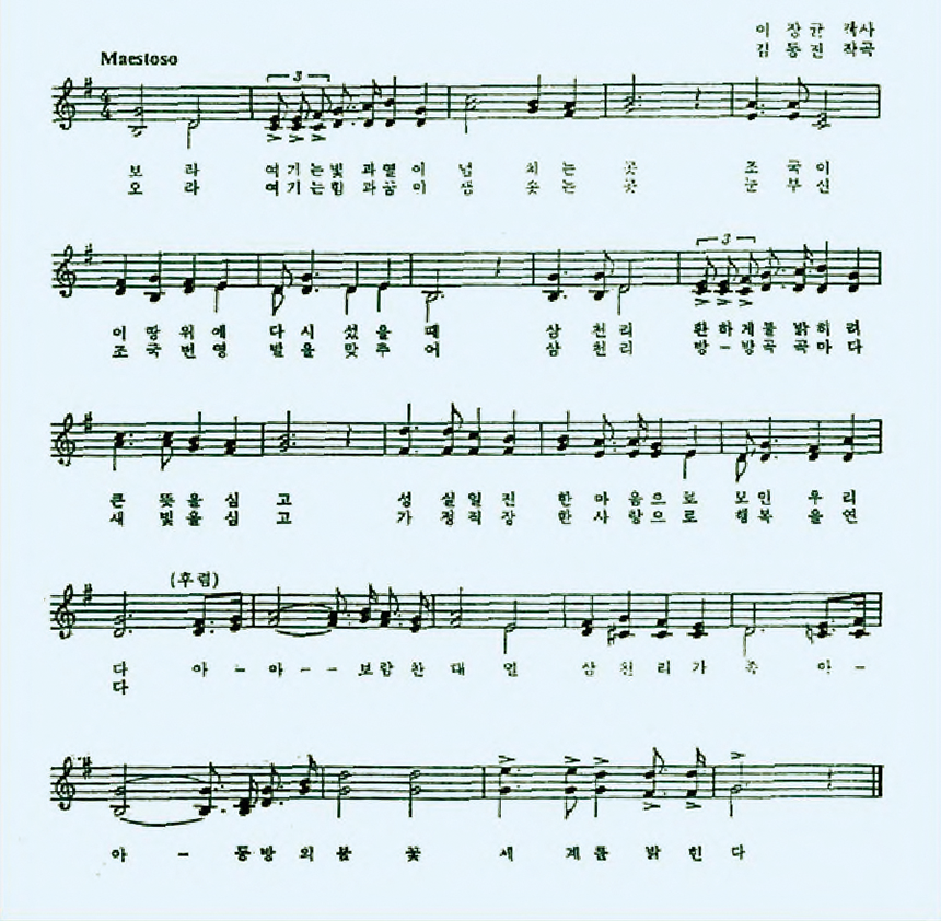 한편, 상호 변경을 단행한 삼천리는 1985년 10월 1일 창립 30주년을 맞아 새로운 모습으로 재탄생한다는 취지에서 사가(社歌)도 새로 제정했다. 이장균 사장이 직접 가사를 쓰고 작곡가 김동진이 곡을 붙인 새 사가에는, 삼천리가 한국의 대표기업으로서 세계로 뻗어나가는 기상과, 가정과 직장이 하나가 되어 발전하려는 ‘가정애·직장애’의 사시(社是) 정신을 담았다.