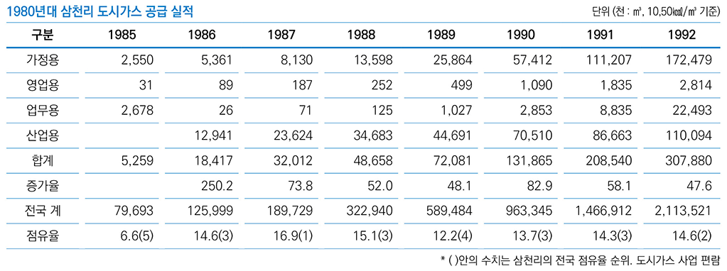 삼천리는 가정용 수요처 증대와 함께 산업용 수요처 개발에도 많은 노력을 기울여 수요처 수를 늘려나갔다. 그 결과 도시가스 공급 3년째인 1985년에는 3만 5,000세대와 5개 업무용 건물, 23개 기업에 총 526만㎥의 도시가스를 공급할 만큼 성장했다. 이는 전국 도시가스 공급량의 6.6%에 해당하는 양이었다. 이듬해인 1986년에는 전년보다 250% 신장한 1,842만㎥를 공급해 전국 도시가스 공급량의 14.6%를 담당했다.