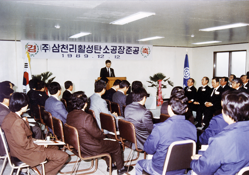 삼천리는 1980년부터 한국화학연구소와 활성탄 제조에 관한 연구를 공동으로 진행하며 활성탄소 사업을 준비했다. 1987년 1월부터 2년에 걸쳐 일본의 스미토모중기와 활성탄 제조 장치에 대한 연구를 진행하기도 했다. 연구 결과를 바탕으로 삼천리는 활성탄소 사업을 추진하기로 하고, 1989년 12월 12일 연산 2,500톤 규모의 고품위 활성탄소를 생산하는 제1기 활성탄소 제조공장을 준공했다.
