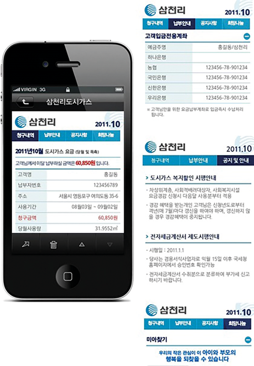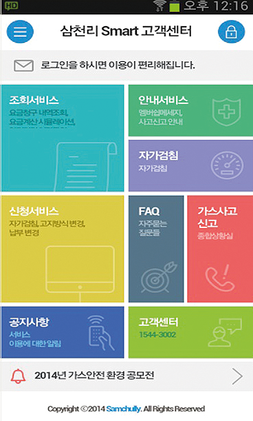 2014년 6월 30일에는 언제 어디서나 도시가스 관련 서비스를 간편하고 손쉽게 이용할 수 있는 모바일 고객센터 ‘삼천리 스마트 고객센터’를 오픈했다. 이에 따라 모든 고객이 모바일을 이용해 청구요금 내역 조회, 요금 계산 시뮬레이션, 요금 고지 및 수납 방식 변경 신청 등 필요한 업무를 신속하고 편리하게 처리할 수 있게 되었다.