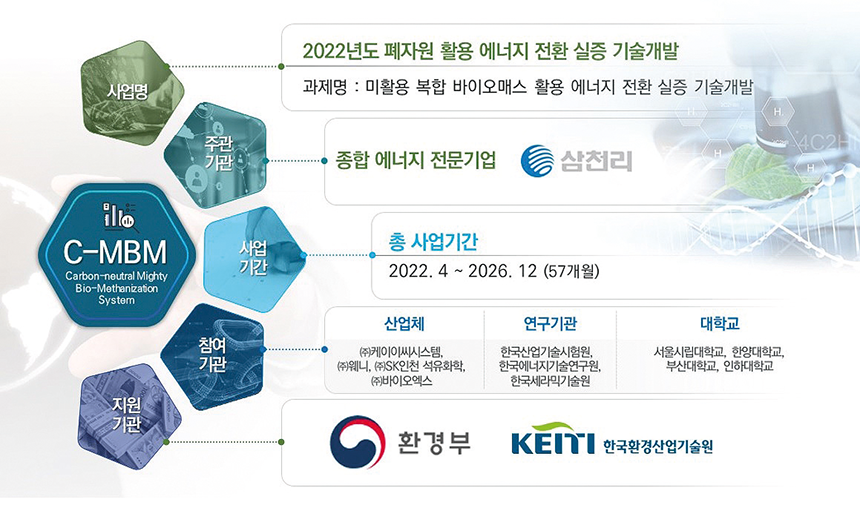 2022년 5월에는 환경부와 한국환경산업기술원의 ‘미활용 복합 바이오매스 활용 에너지 전환 실증 기술 개발’ 지원사업의 주관사로 선정돼 연구에 착수했다. 이 사업은 그동안 매립·소각되고 미활용되던 동식물 잔재물 등의 바이오매스를 혐기소화(생분해성 유기물질이 무산소 상태에서 미생물에 의해 분해되는 과정)하여 바이오가스로 전환하기 위해 추진되는 과제이다.