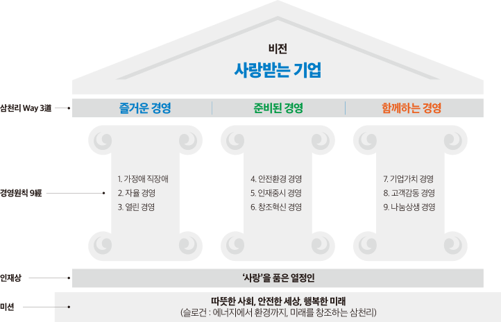 새 비전을 통해 삼천리가 추구하는 인재상도 ‘사랑을 품은 열정인’으로 명확히 정의했다. ‘열정’, ‘사랑’, ‘실천’이 키워드이다.